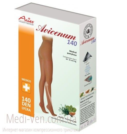 Противоварикозные колготы Aries Avicenum 140 при систематическом использовании согласно назначению врача препятствуют формированию варикозного расширения вен и деформации на стенках капилляров, уменьшают отечность стопы и снижают риск образования тромбов